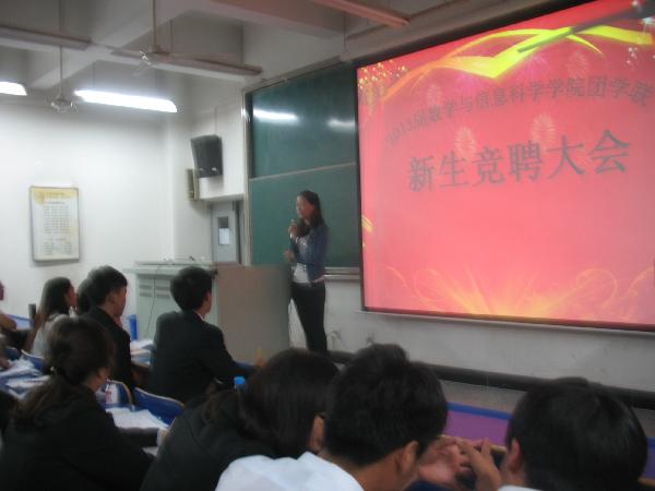 金秋送爽,微风习习,又到了团学联一年一度的纳新时刻。这场由数学与信息科学学院团学联举办的新生竞聘大会于10月9日至10月11日在2号楼310教室和1号楼311教室隆重举办。出席本次大会的有数学与信息科学学院团学联主席、副主席、各部部长、副部长各位竞聘者亲友团。